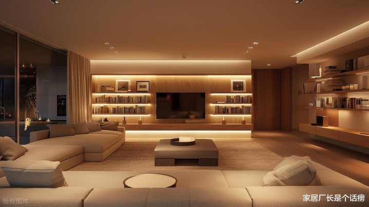 功能进化: 根据不同场景灵活调节,比如观影时,只保留电视墙的柔和灯带;阅读时,开启沙发旁的落地灯;朋友聚会,则让所有筒灯、射灯全开,营造明亮热闹的氛围······这种是传统主灯提供不了的情绪价值。